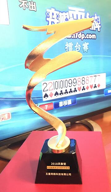 上海五星网络科技有限公司凭借棋牌类及电竞类丰富多彩的内容、线上线下的融合、以及成功的商业运营,荣获了2018风掣奖“年度最具商业价值体育媒体“的称号。