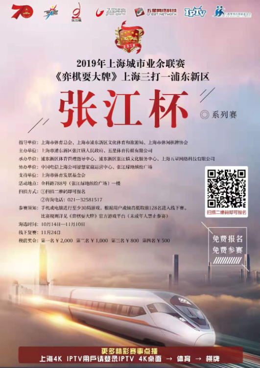 重大消息:获得“张江杯”分站赛的冠军将与浦东新区其余分站赛冠军争夺《弈棋耍大牌》年终盛典名额,竞争10万元现金大奖。