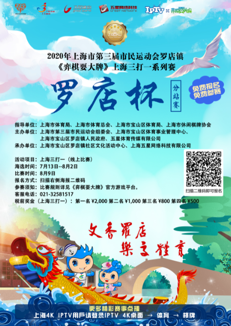 精彩纷呈激动人心的比赛还历历在目,就在这个7月,2020年上海市第三届市民运动会宝山区《弈棋耍大牌》上海三打一系列赛“罗店杯”分站赛又回来了。虽然因疫情的影响,我们无法继续在线下与各位热爱上海三打一的牌迷朋友们面对面的见面了,但罗店镇与我们《弈棋耍大牌》依然为牌迷朋友们提供了线上竞技平台,让我们选手足不出户,即可在线与上百名棋牌好手同场竞技,展现实力,争夺4强席位,只要您大浪淘沙,脱颖而出,成为4强选手,即可前去《弈棋耍大牌》演播厅,争夺分站赛冠军宝座,还等什么,赶紧来报名吧!