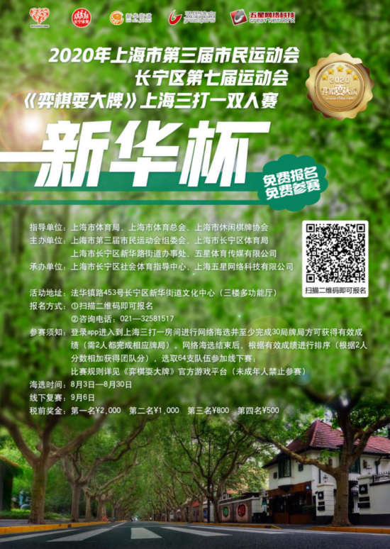 参赛须知:电脑端或者手机端进行至少30局(需2人都完成相应牌局)上海三打一游戏,根据用户成绩高低(根据2人分数相加获得团队分)取前64支队伍进入线下赛。比赛规则详情见《弈棋耍大牌》官方游戏平台。(注:年满18周岁居民均可报名参赛)。