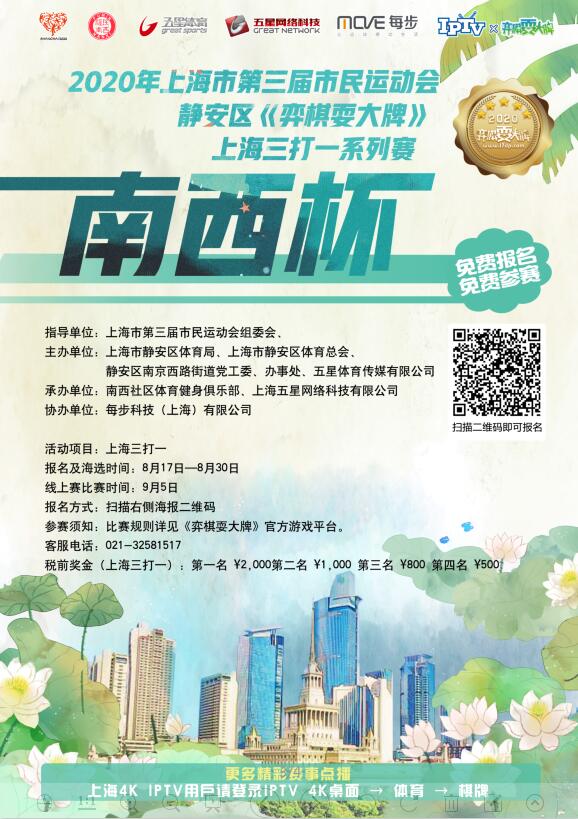 各位静安区南京西路的牌迷朋友们大家好,你们喜爱的《弈棋耍大牌》回来啦。2020年8月17日,《弈棋耍大牌》上海三打一静安巡回赛又来到了我们南京西路街道。我们的活动和静安体育局,静安区的各个街道已经一起走过了三年,良好的合作关系给广大居民朋友带来了精彩纷呈,紧张刺激的活动与比赛,今年南京西路街道是我们静安巡回的第二站,让我们来再一次的走进静安,走进南西。
