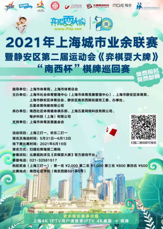 各位牌迷朋友们大家好,今年恰逢是《弈棋耍大牌》节目创立十周年,我们继续联合了静安区体育局为大家奉上2021年上海城市业余联赛暨静安区第二届运动会《弈棋耍大牌》棋牌巡回赛。我们《弈棋耍大牌》和静安区体育局一起携手走过了4年的时间,在这4年里我们逐步的把静安区《弈棋耍大牌》棋牌巡回赛打造成了静安区的明星体育赛事,越来越多生活和工作在静安区的朋友们参与到了我们的活动中,得到了大家的认可,就是我们最开心的事情。今年静安区《弈棋耍大牌》棋牌巡回赛的第一站放在了具有悠久文化历史底蕴的南京西路街道,今年的活动恢复了以往网络海选加线下复赛的模式,让牌迷们能够在线下充分释放热情,同时今年我们还考虑到不方便来到现场的选手,所以我们增加了纯线上的欢乐二打一比赛,一起比赛,分享欢乐。