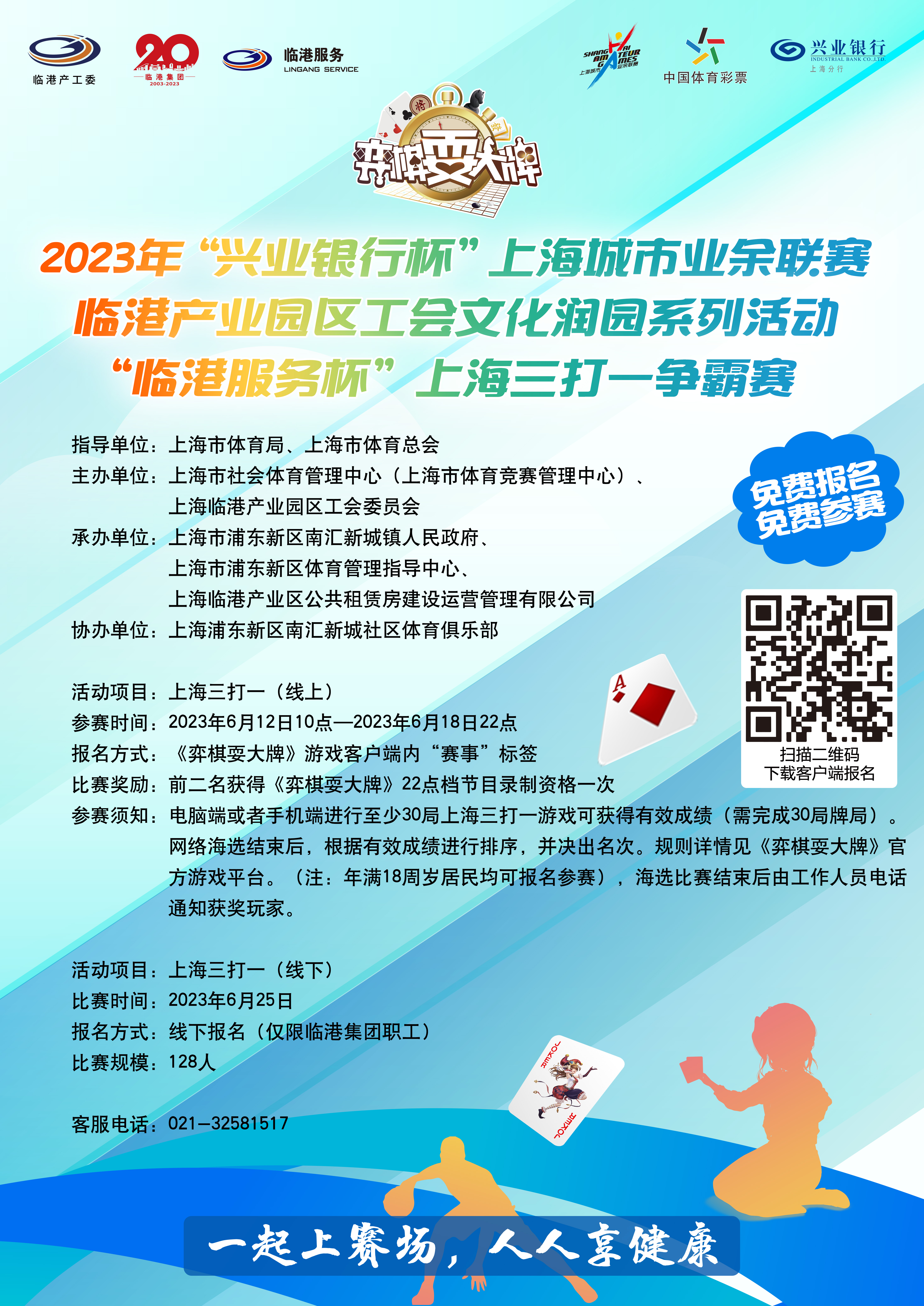 参赛须知:电脑端或者手机端进行至少30局上海三打一游戏可获得有效成绩(需完成30局牌局)。网络海选结束后,根据有效成绩进行排序,并决出名次,规则详情见《弈棋耍大牌》官方游戏平台。(注:年满18周岁居民均可报名参赛),海选比赛结束后由工作人员电话通知入围的每位玩家。