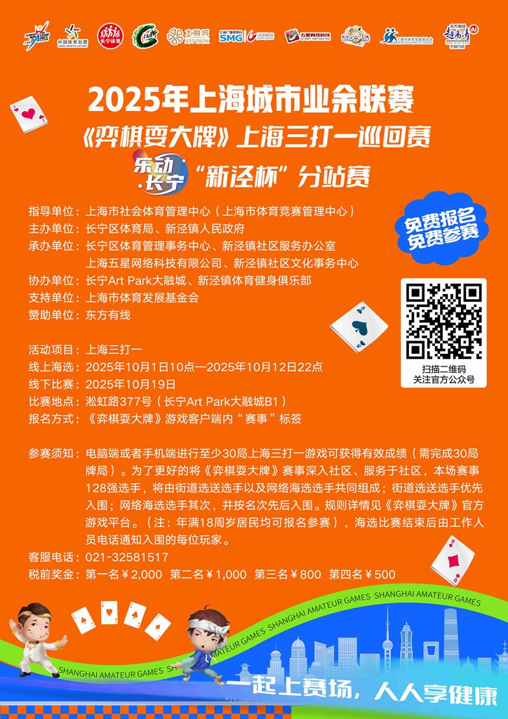 2025年上海城市业余联赛《弈棋耍大牌》上海三打一巡回赛——乐动长宁“新泾杯”分站赛线上海选正式启动!街道线下赛作为《弈棋耍大牌》经典品牌,每年吸引数十万选手参与。今年赛事再升级,诚邀您与全市牌友同台竞技!