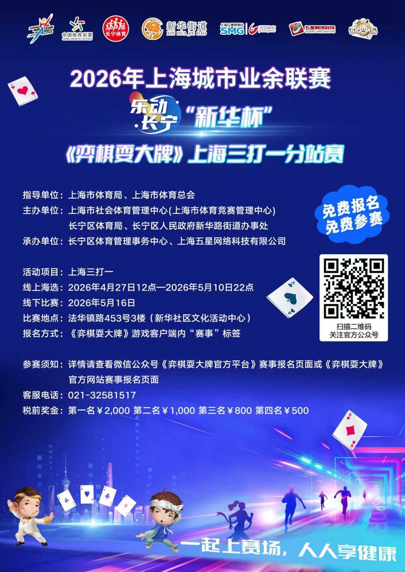 2026年上海城市业余联赛——乐动长宁“新华杯”《弈棋耍大牌》上海三打一分站赛线上海选正式启动!街道线下赛作为《弈棋耍大牌》经典品牌,每年吸引数十万选手参与。今年赛事再升级,为进一步优化《弈棋耍大牌》街道赛的赛事体验,提升晋级机会的公平性与覆盖面,让更多选手有机会参与后续角逐,参赛条件与比赛赛制重大改革,诚邀您与全市牌友同台竞技!